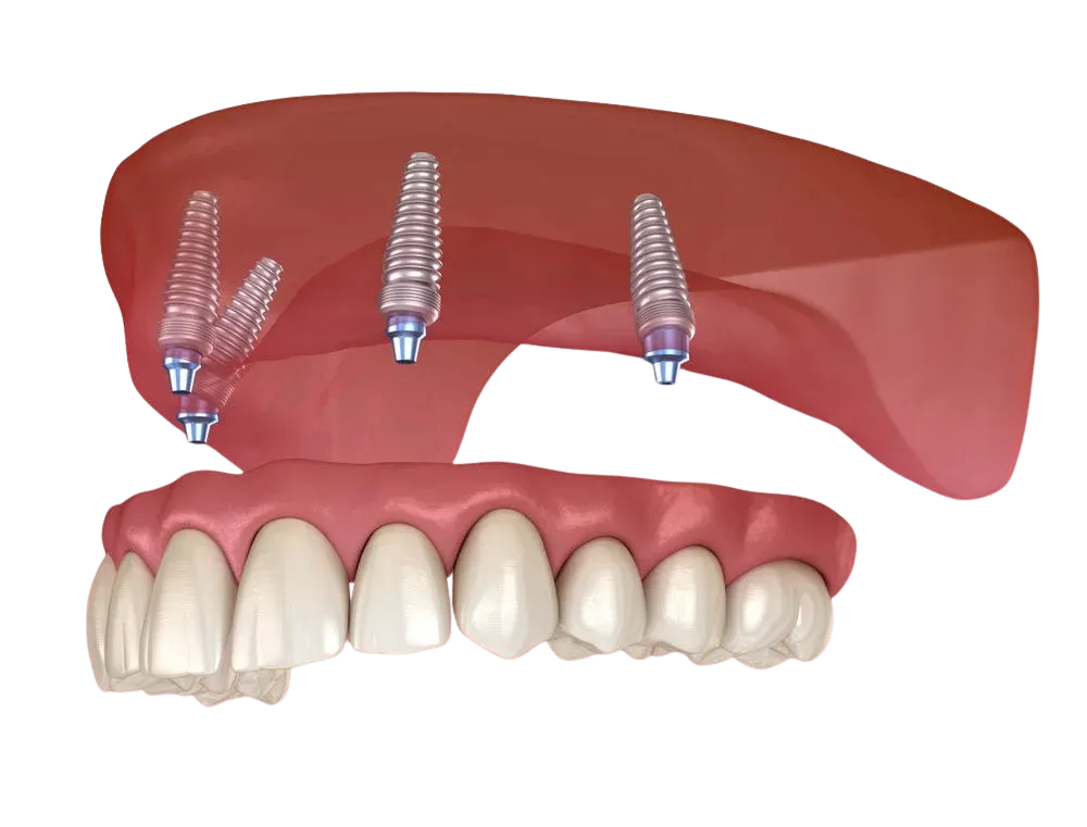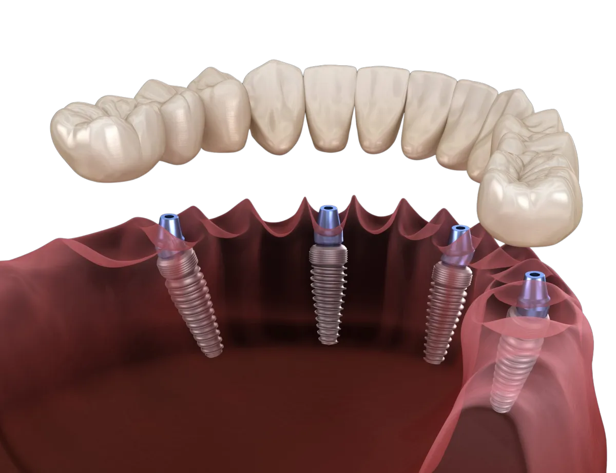 - На одну часть устанавливаются 4 имплантата: 2 в передний отдел и 2 в жевательный.